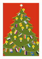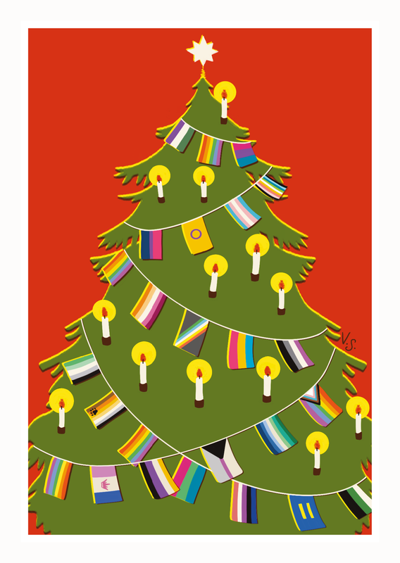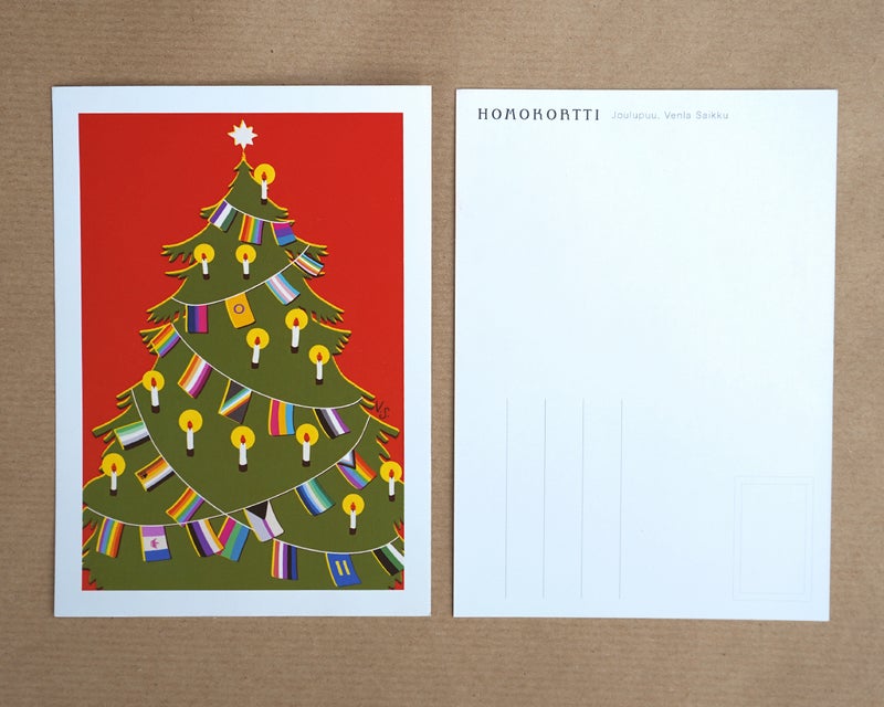 Tässä vintage henkisessä kuusessa liehuu perinteisten Suomen lippujen sijaan eri sateenkaariyhteisöjen lippuja. Eri identiteettien liput edustavat sitä huojennusta ja yhteenkuuluvuuden tunnetta, jota oman identiteetin löytäminen voi tuoda. Kortti on inspiroitunut 1900-luvun alun korteista ja niiden painotekniikasta.