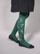 Käsin painetut 70 denierin sukkahousut. Kolibri -printti kulkee kummankin säären ulkosyrjällä. Printin on suunnitellut tekstiilisuunnittelija Miira Zukale.