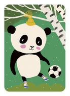 Kotimainen 1-osainen postikortti laadukasta kartonkia. Kuvassa jalkapalloa potkiva panda, kaksi koivua sekä vihreä tausta. Kortissa ei ole tekstiä.
