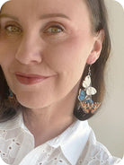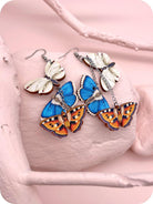 Menneenä kesänä kävi niin, että eräs korvissuunnittelija ei millään meinannut löytää korvisvalikoimastaan asuunsa sopivaa paria. Kun piti saada juuri tietyt värit, tietenkin ja tottakai. Koruvarastoa kaivellessa nuo pikkuperhoset sattuivat sitten osumaan sopivasti samaan rykelmään ja näytti kuin olisivat tanssineet. Eivätkä pelkästään tanssineet, vaan muodostivat kaipaamani värikombon. Siinä hetkessä syntyi iloisen näyttävä, kevyt ja moneen menoon oivasti sopiva TANSSI.