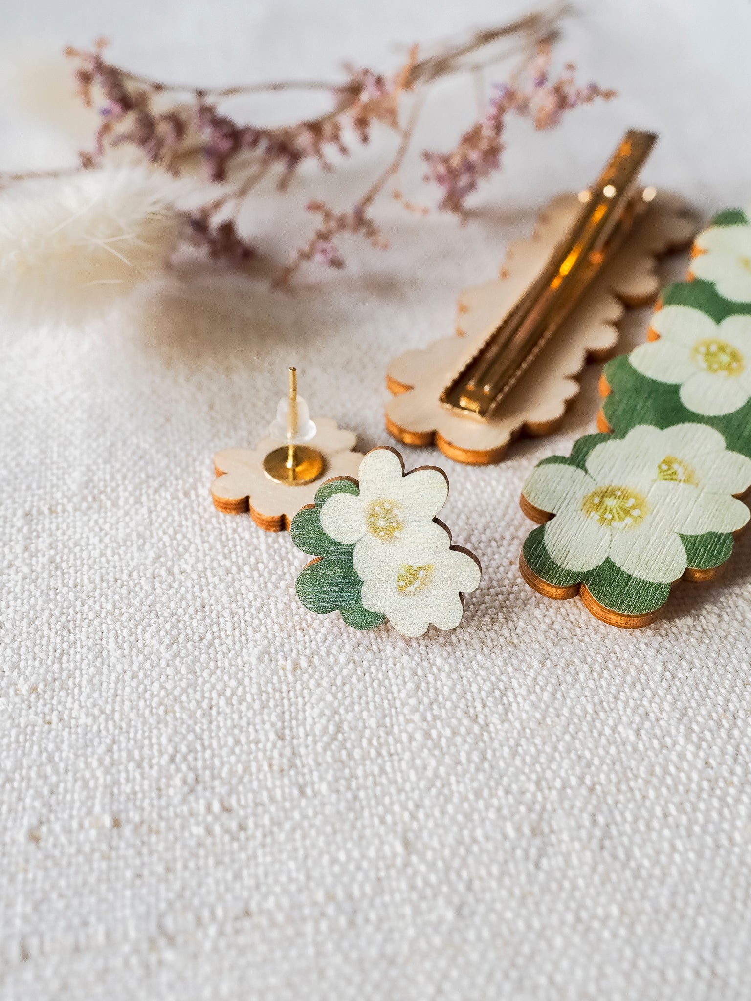 Saima Visualsin korut ja hiuspinnit on suunniteltu ja valmistettu Suomessa, ja niillä on Design from Finland ja Avainlippu -merkit.