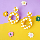Puiset nappikorvakorut keltavalkoisella ruutukuviolla.