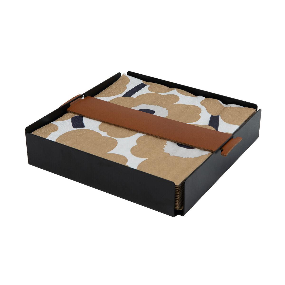 Servettikoppa on valmistettu maalatusta teräksestä ja nahasta Suomessa. Servettiteline soveltuu erinomaisesti 33x33cm: n kokoisille serveteille. Lautasliinatelinettä voidaan käyttää myös tarjoilualustana vaikka makeisille, se on kiva yksityiskohta kattauksissa ja tuo kauneutta arkeen. Servetit eivät kuulu mukaan koppaan.