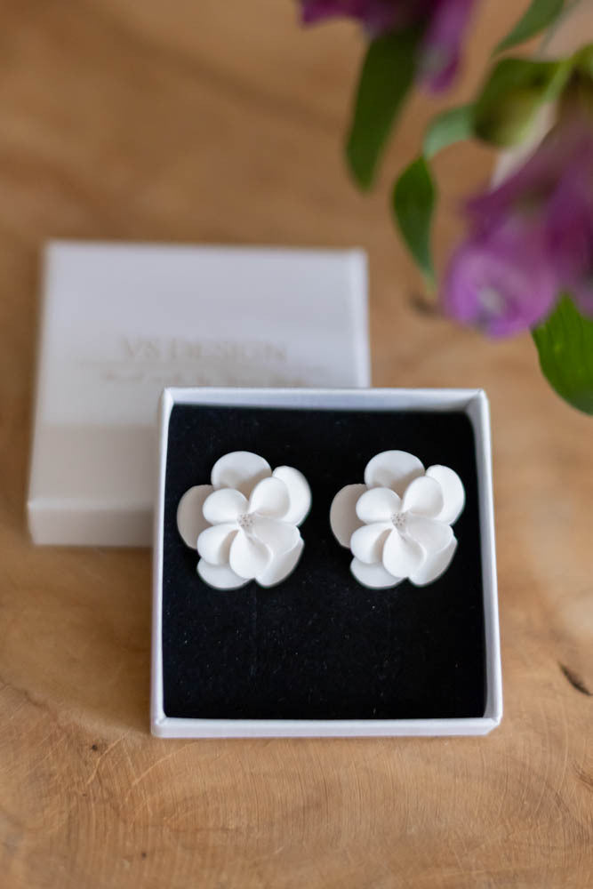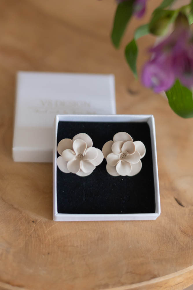 Ellen korvakorut ovat valmistettu käsityönä polymeerimassasta, kaunis kukka sopii niin arkeen kuin juhlaan.