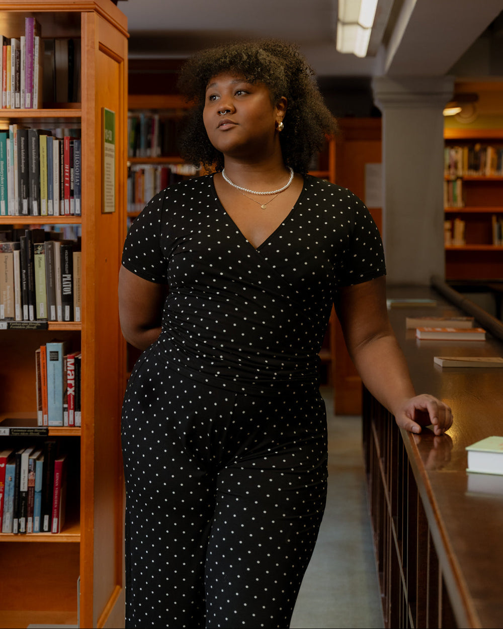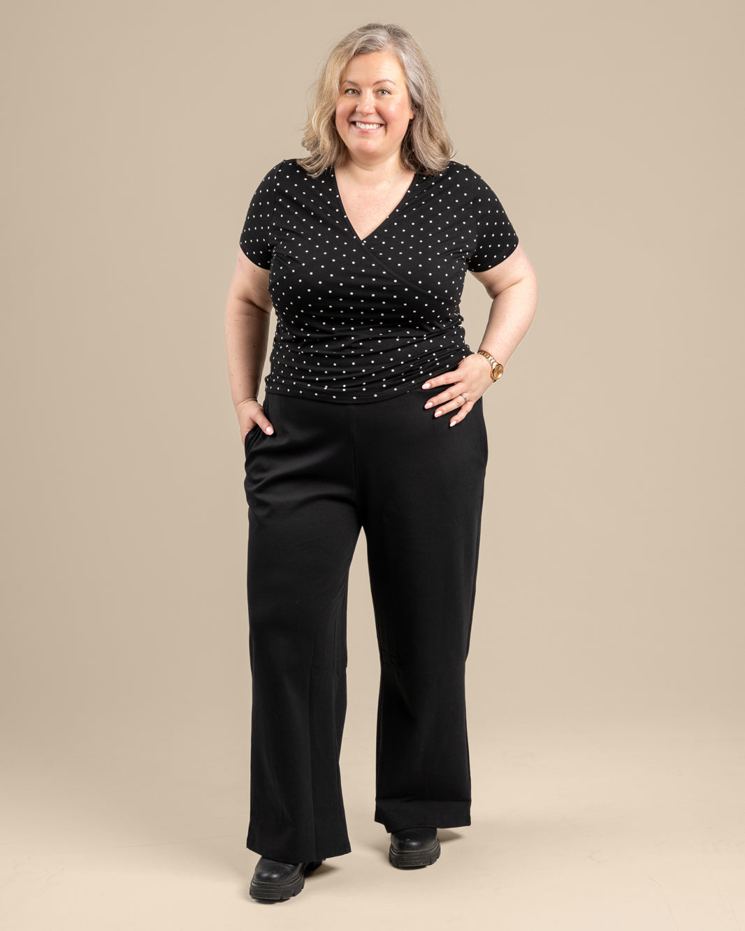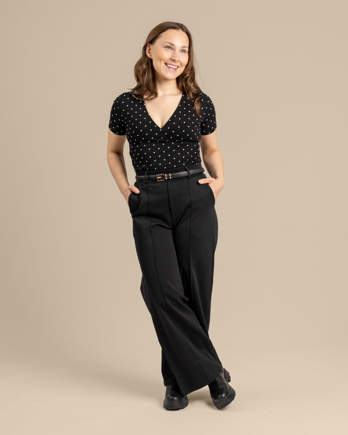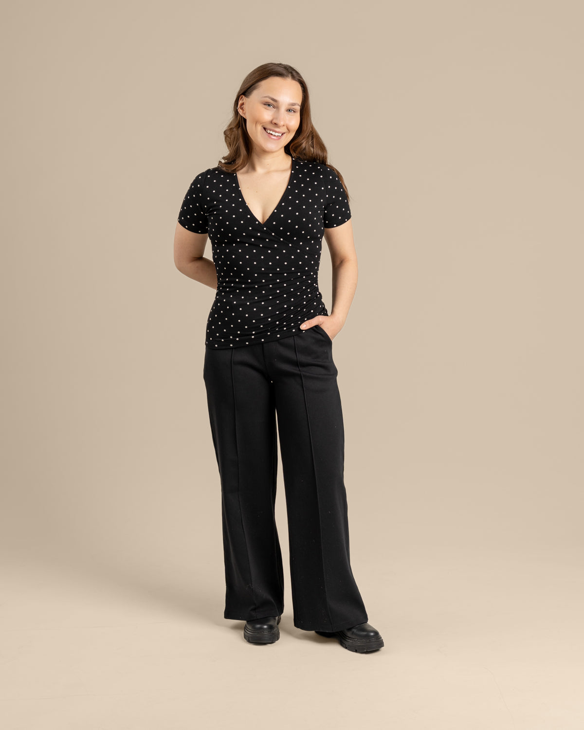 Kietaisupääntie t-paita tyylikkäässä pilkkukuosissa. Materiaali on upeaa LENZING™ ECOVERO™ viskoosia, joka tuntuu iholla ihanan ylelliseltä ja pehmeältä. Sivusaumoissa imartelevat poimutukset.