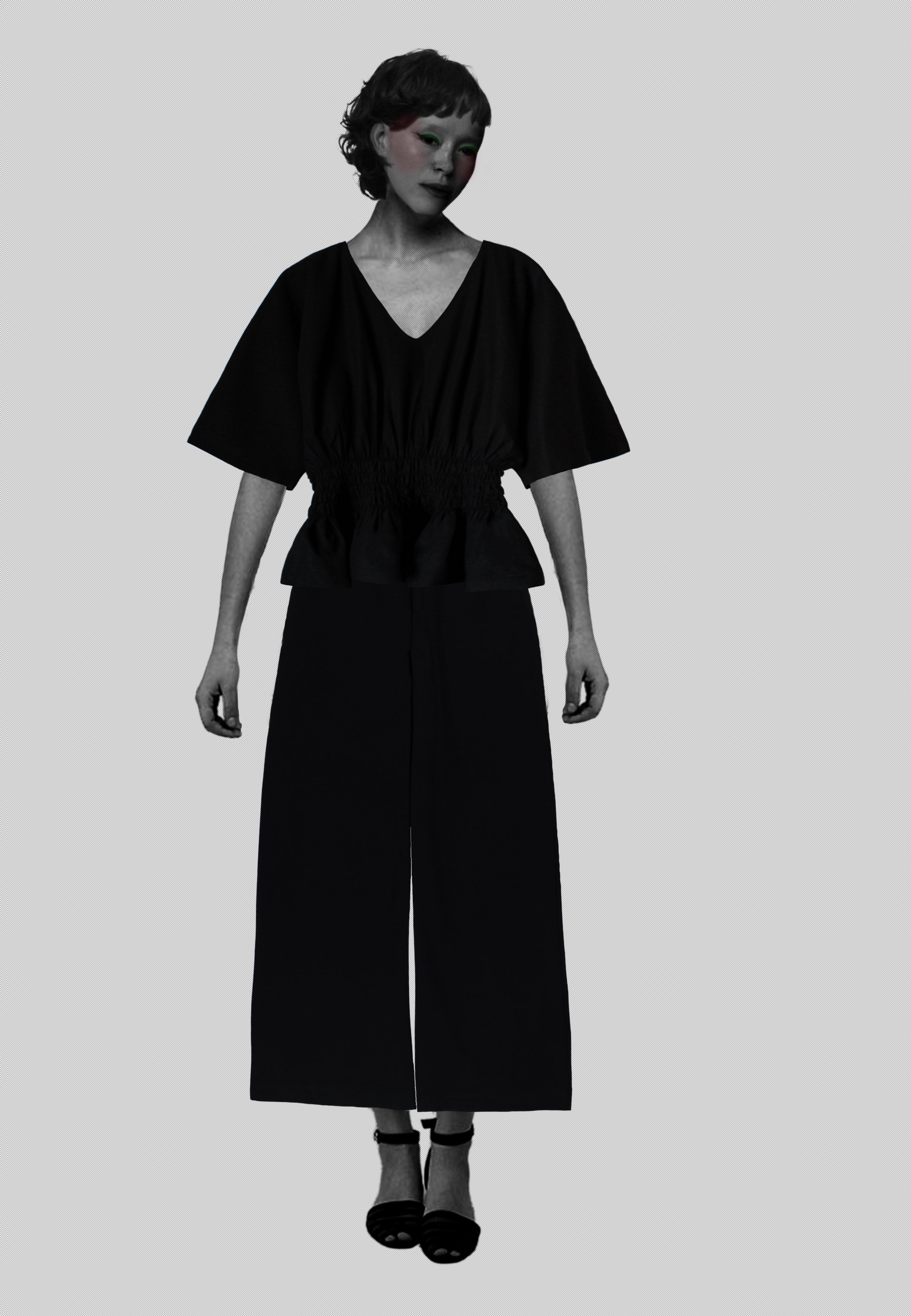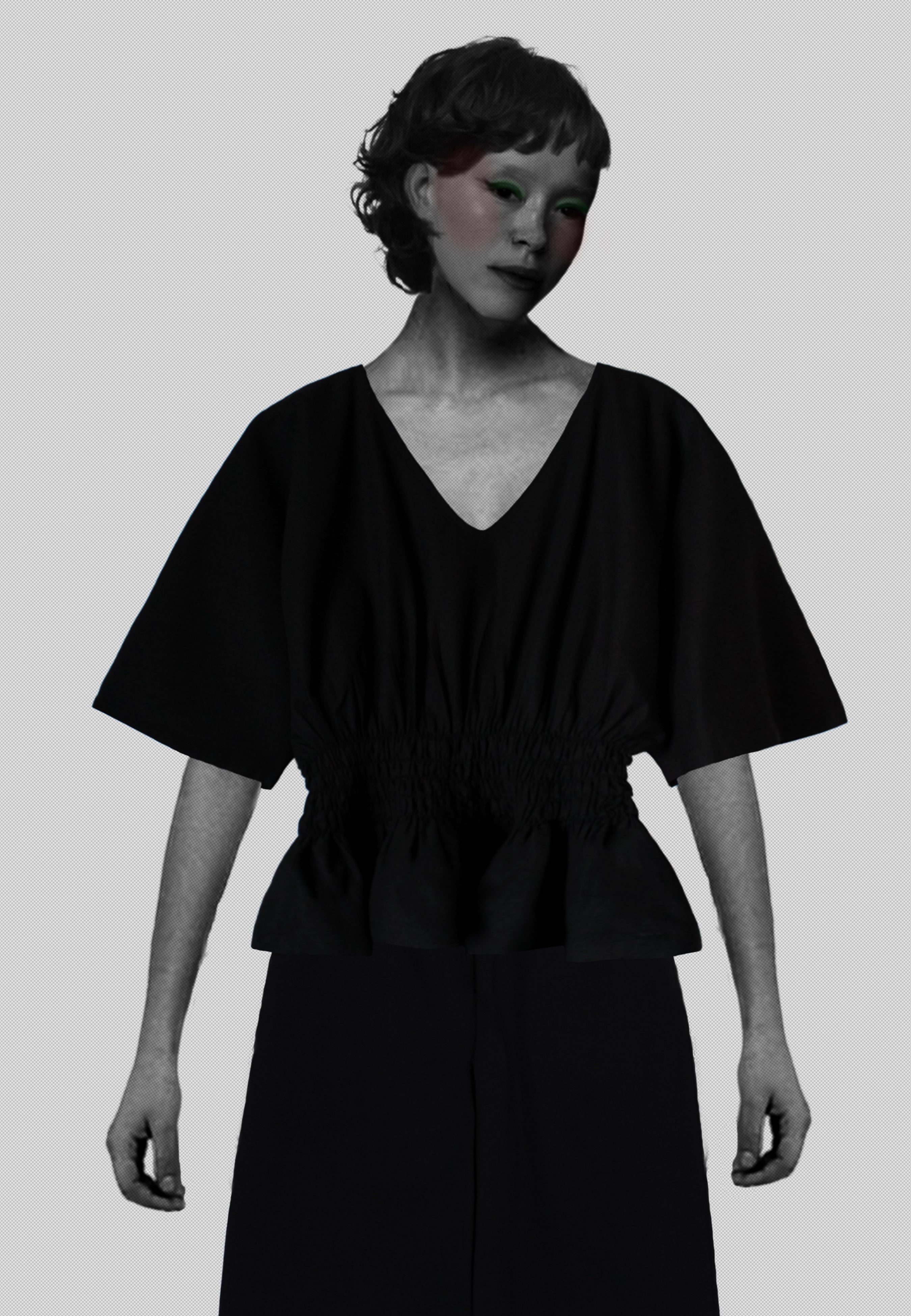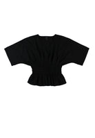 Kimonohihainen pusero kauniisti laskeutuvaa mustaa viskoosi/pellavasekoitetta. Materiaalissa yhdistyy viskoosin laskeutuvuus ja pellavan viileys. Puserossa on V-mallinen pääntie ja vyötäröllä smokkikumilankarypytys. Vyötärön rypytys on mukavan tuntuinen ja erittäin joustava.
