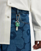 Puhallus-avaimenperässä on tupla Unikko-kukka, Marimekko-laatta, avainrengas sekä klipsi.