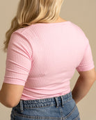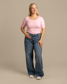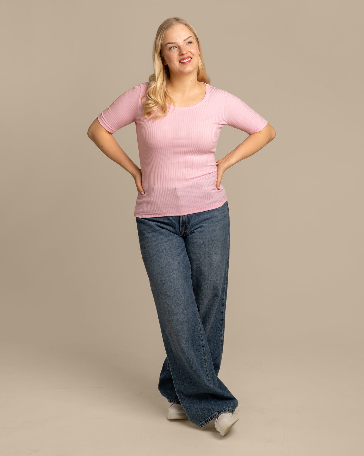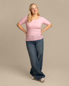 Pinkki vartalonmyötäinen ribbi t-paita. T-paidassa on paljon toivottu avarampi pääntie. Materiaali on joustavaa ja hyvin hengittävää ribbiä.