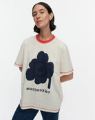 Tarttua-t-paidassa on unisex-mitoitus ja suuri painettu Unikko-kukka sekä Marimekko-logo etupuolella. T-paidassa on kontrastivärinen resori pyöreässä pääntiessä ja kontrastivärillä ommellut päällitikkaukset.