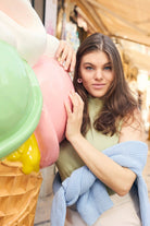 Neuleessa on v-pääntie, istuva olka ja täyspitkät leveähköt hihat. Helmassa ja hihansuissa on resorineulos. Malliltaan neule on rento ja väljä. Neuleen sävynä vaaleansininen.