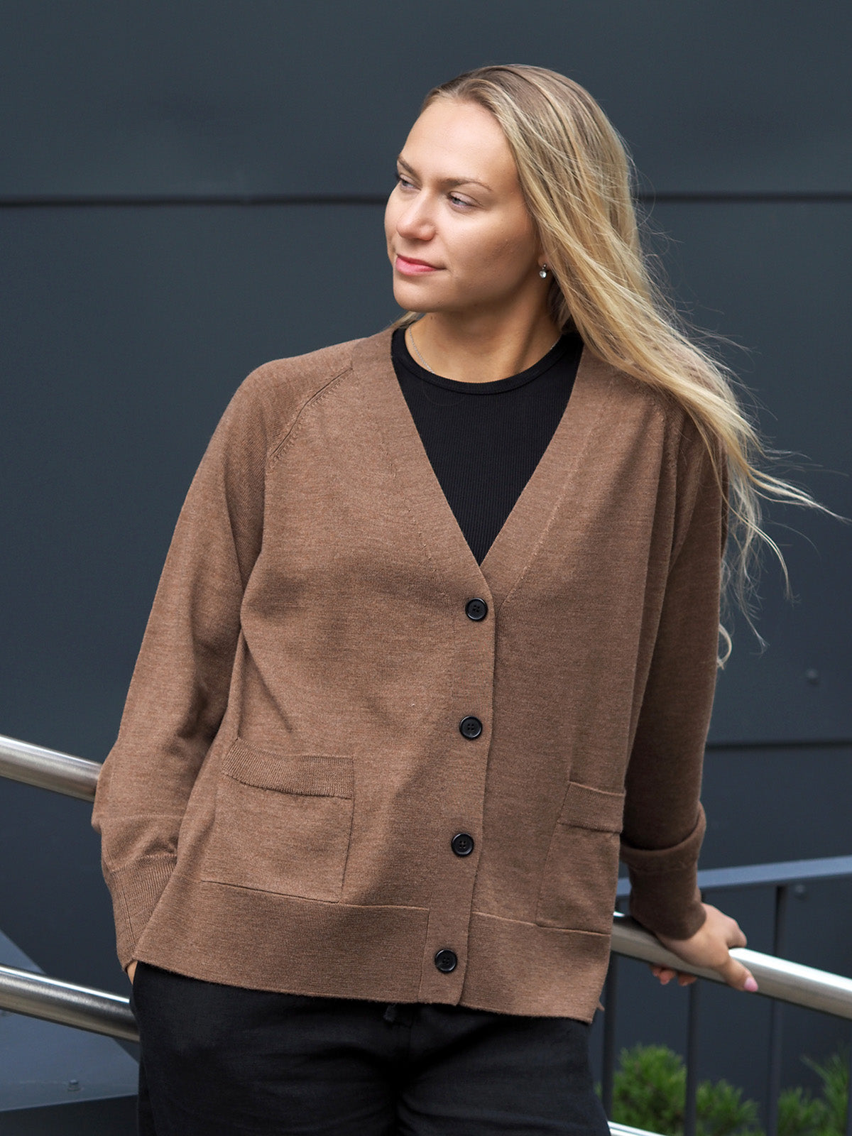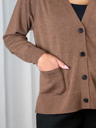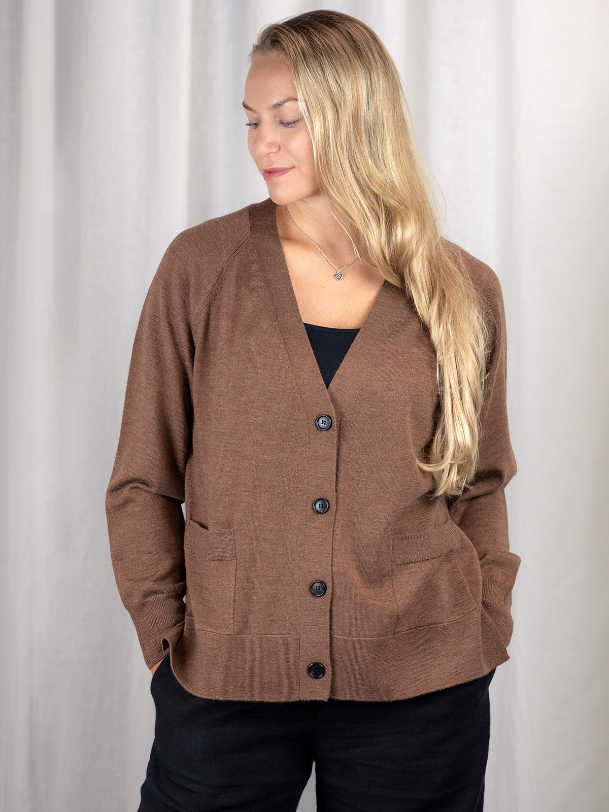Notkeana ja mukautuvana Hermione mahtuu mainiosti vaikkapa takin alle. Villatakissa on V-pääntie ja etukiinnitys neljällä napilla, edessä myös pienet taskut. Helmassa on sivuhalkiot helman resorineuloksessa. Resorineulos ei ole helmaa kiristävä, vaan jatkaa villatakin suoraa linjaa ja laskeutuu kauniisti lantiolle.
