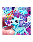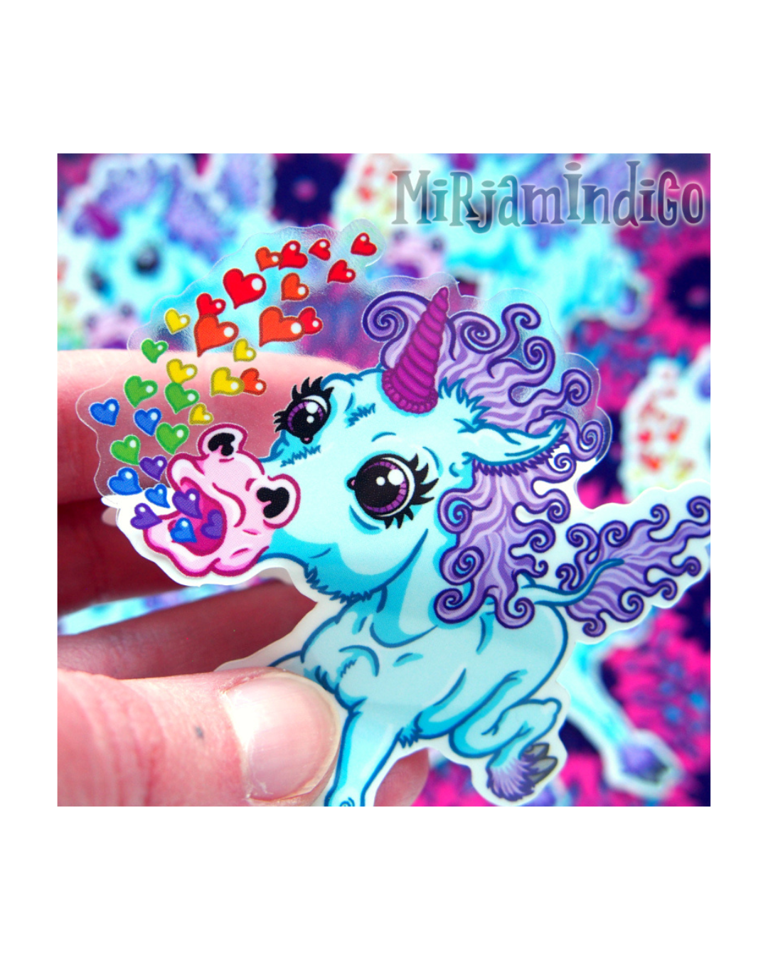 Yksisarvinen on piirusteltu alun alkaen Mirjamindigon ollessa vasta muutaman vuoden ikäinen yrityksen raakile. Sydämiä yrjöttiin tuolloin pieneränä itse printatuissa korteissa, mutta kortit myytiin loppuun ja yksisarvinen jäi piirustusvihkoon horrostamaan. Välillä on kyllä ollut mielessä, että tätä konia pitäisi vielä hyödyntää… ja nyt hän on vihdoin piirretty digitaaliseen muotoon, ja läpsäytetty hetimmiten vinyylitarraksi!