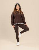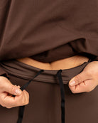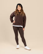 Leggingsit tummanruskeassa sävyssä. Mukavat ja joustavat leggingsit joka tilanteeseen. Materiaali on miellyttävän paksua, jolloin leggingsit tuntuvat ja näyttävät ryhdikkäiltä päällä, eikä niistä näy läpi. Vyötäröllä on kiristysnauha. Suosittelemme tätä keskimmäistä pituutta, jos jalkasi sisämitta on 77-90cm.