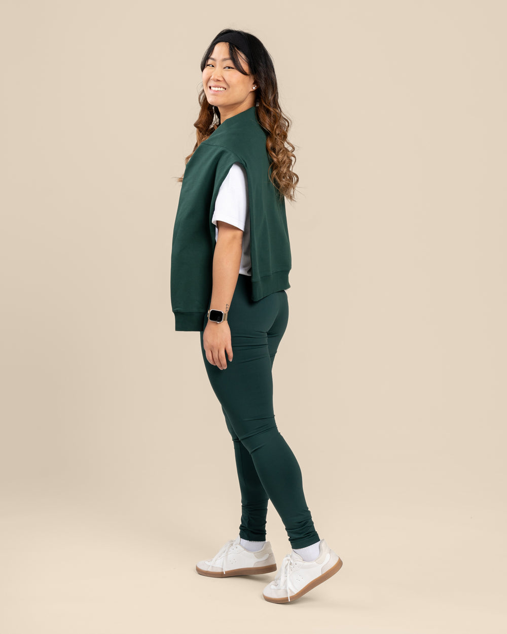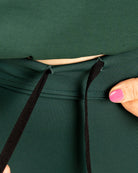 Leggingsit tummanvihreässä sävyssä. Mukavat ja joustavat leggingsit joka tilanteeseen. Materiaali on miellyttävän paksua, jolloin leggingsit tuntuvat ja näyttävät ryhdikkäiltä päällä, eikä niistä näy läpi. Vyötäröllä on kiristysnauha. Suosittelemme tätä keskimmäistä pituutta, jos jalkasi sisämitta on 77-90cm.