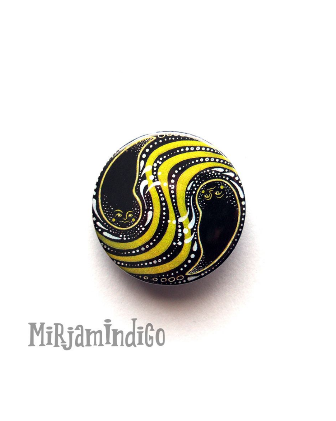 Pienet hymyilevät henget ilakoivat vihertävän joen pyörteissä, tässäpä hieman mystisempi rintanappi vaikkapa reppua koristamaan.