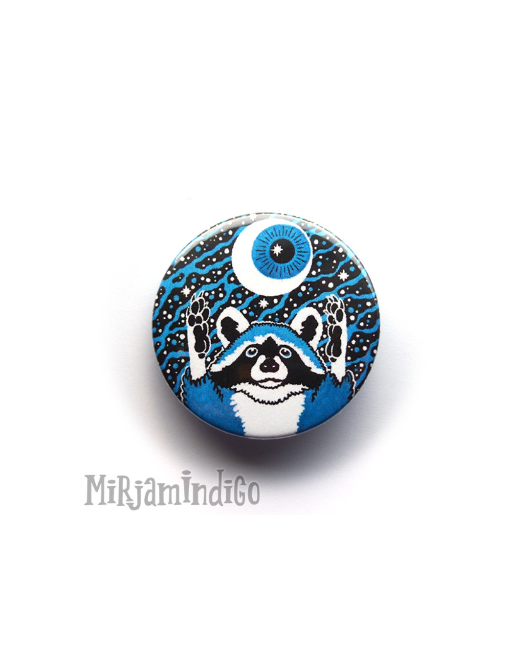 Suloinen sininen pesukarhu rintanapin muodossa, vaikkapa takin pieltä tai laukkua koristamaan.