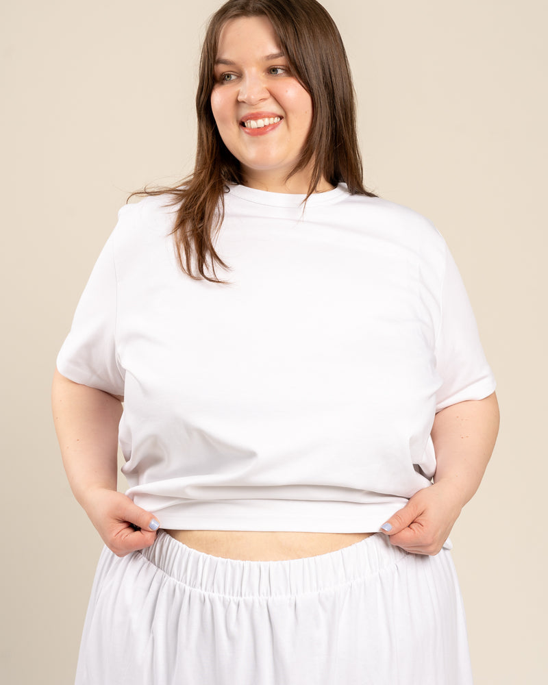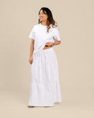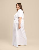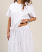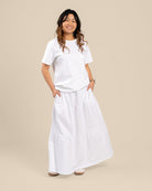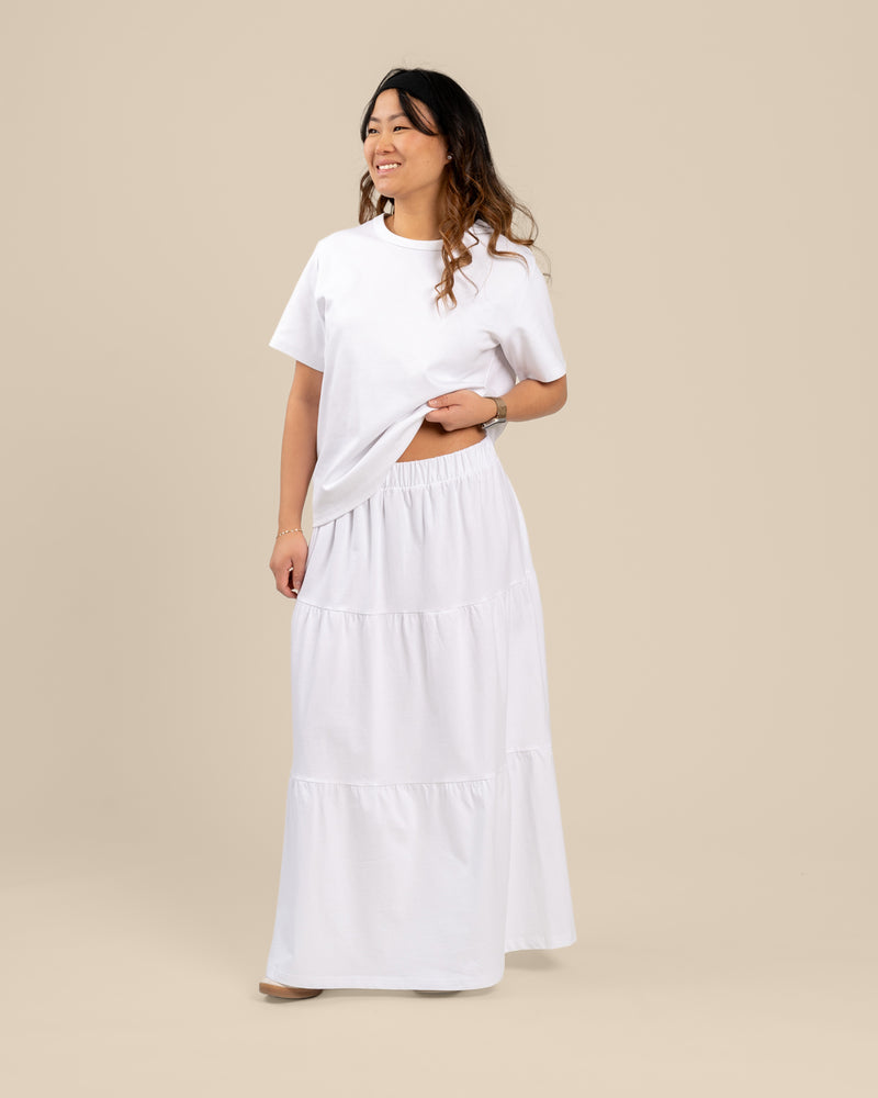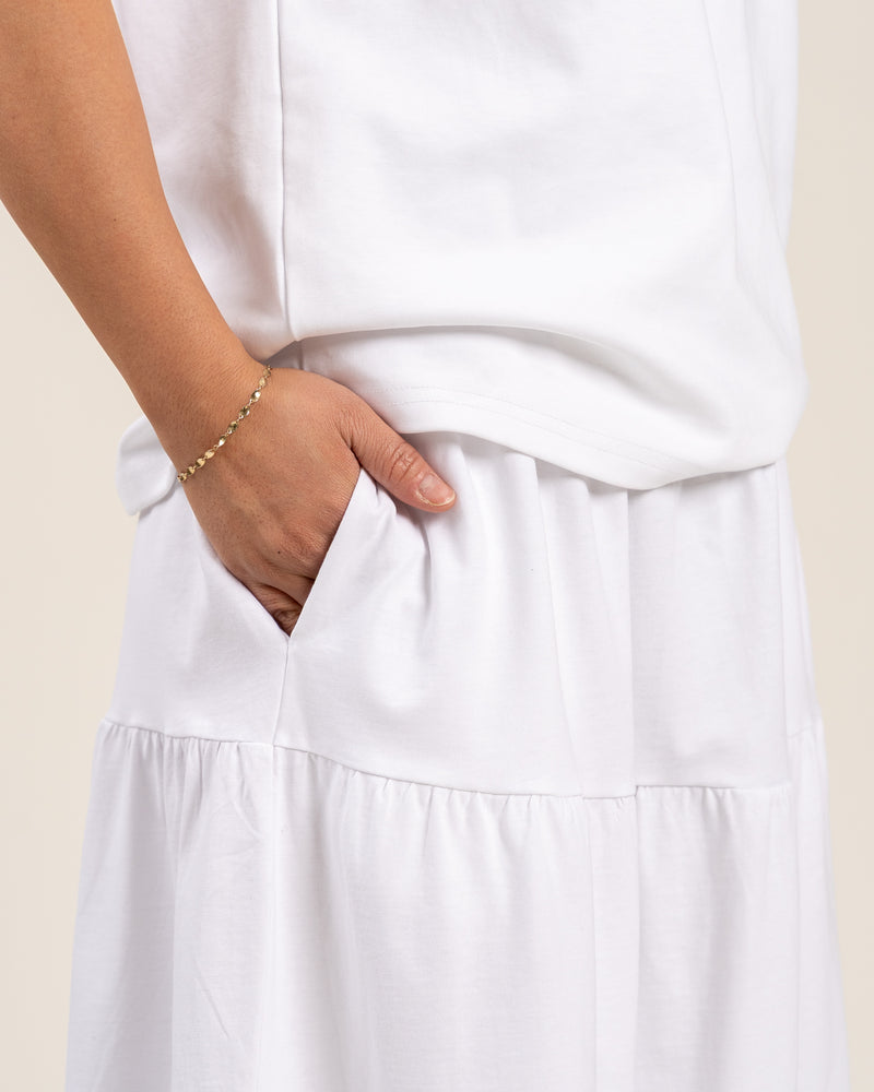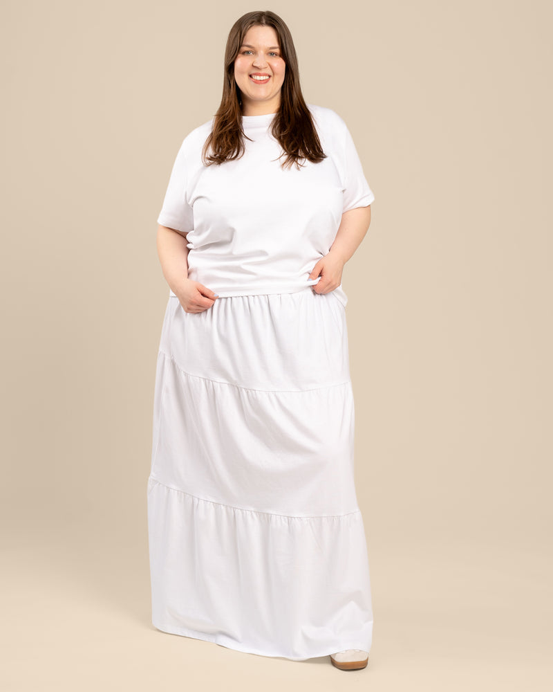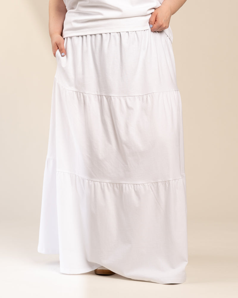 Tyylikäs kerroshame optisen valkoisessa värissä. Hameessa on A-linjainen malli, mukava kuminauhavyötärö. Leveä helma tuo hameeseen keveyttä ja liikkuvuutta – monikäyttöinen valinta arkeen ja juhlaan!