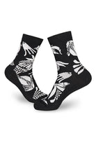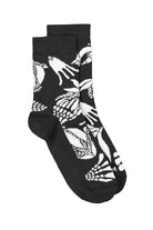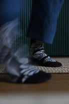 Laadukkaasta Pure Waste -langasta Tampereella neulotut sukat ovat jalassa ihanan pehmoiset. KEMUT-kuosi on todellinen katseenvangitsija, joka on kuitenkin mustavalkoisuutensa ansiosta helposti yhdisteltävissä asuun kuin asuun. Sukan kärki- ja kantaosat sekä pohja ovat mustat parhaan mahdollisen kestävyyden takaamiseksi. Materiaali on joustava, mutta pitää muotonsa ja palautuu hyvin.