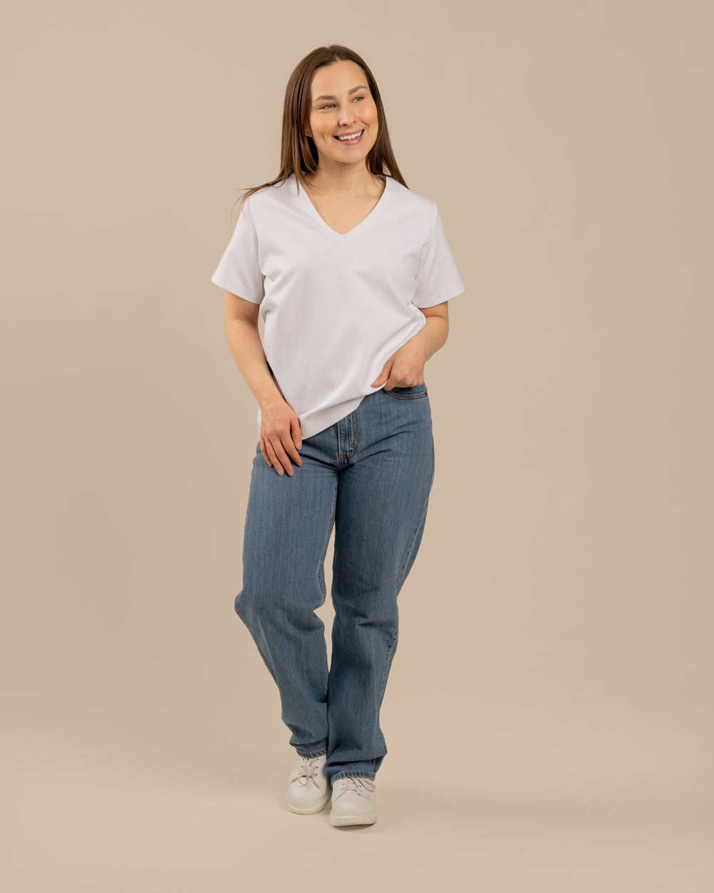T-paidassa on rento malli, joka on suunniteltu naisten vartalonmittataulukon mukaan. Se on valmistettu paksusta ja laadukkaasta neuloksesta, josta ei varmasti näy läpi. V-pääntie on sama kuin V-pääntiemekossa, ja mitoitus vastaa Arki t-paidan mitoitusta.